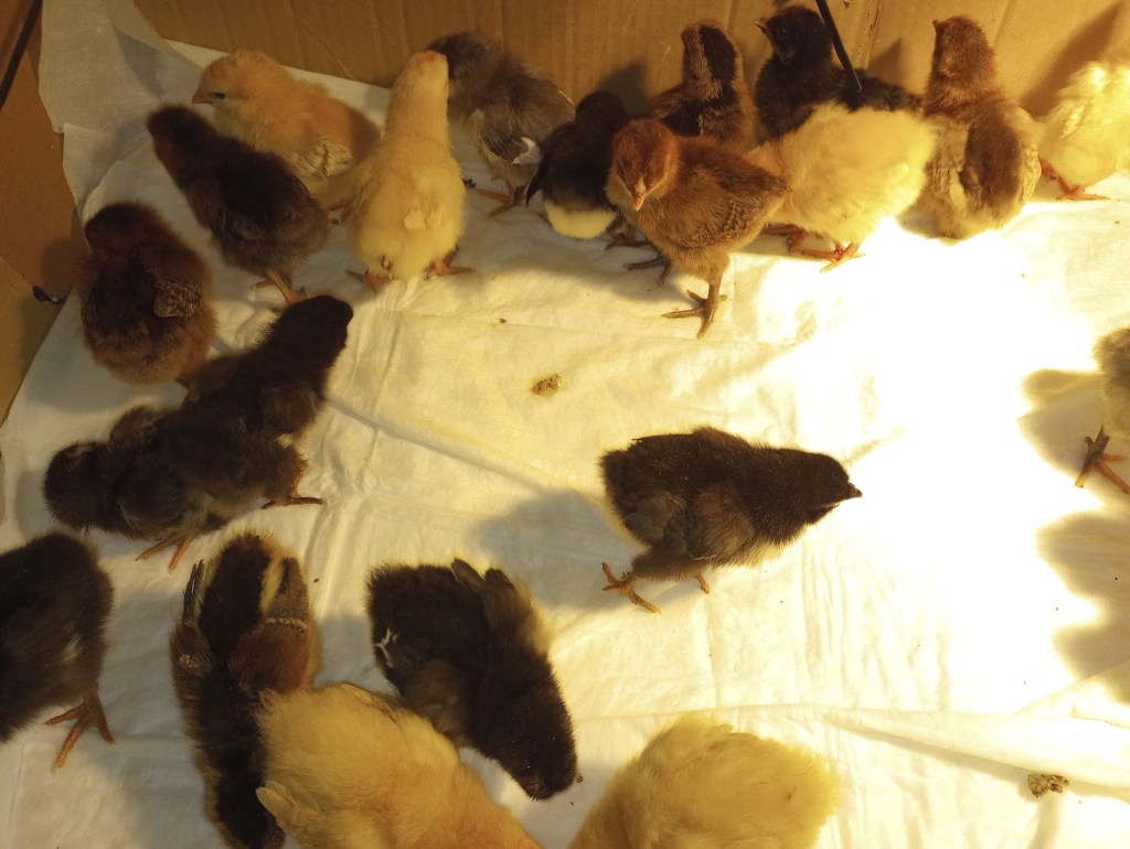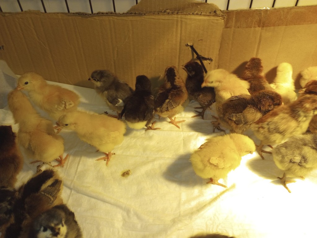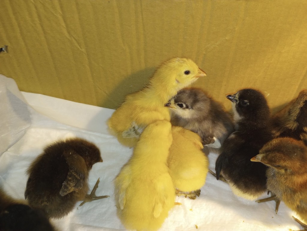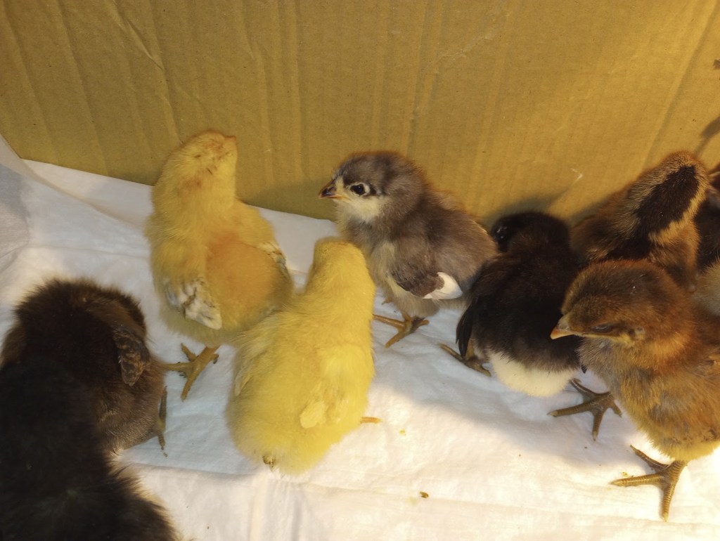 What’s left of our baby chickens. They were one week old yesterday and today. I have several breeds available.