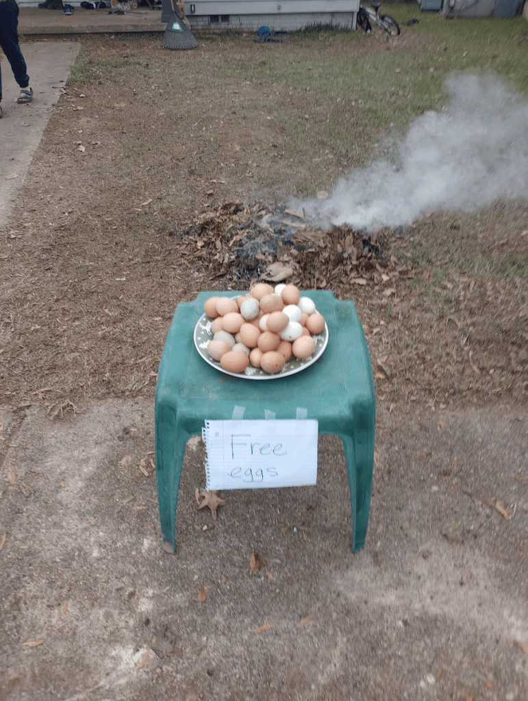 Free Eggs (Nov. 2024) Posted bylionoatmealpluto23254November 7, 2024December 1, 2025Posted inShopping for Poultry BLOGS Once again, we are giving away our eggs for free. Share this: Click to share on X (Opens in new window) X Click to share on Facebook (Opens in new window) Facebook Like Loading... Related
