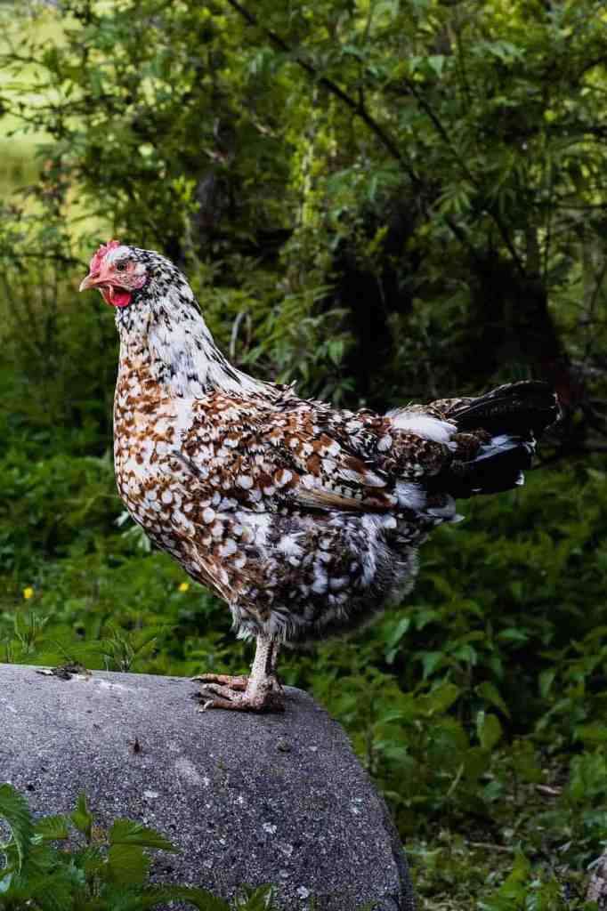 Swedish Flower Hens are a rare beautiful speckled chicken. They are mottled orange and white but also come in many other colors. They lay 150-200 large brown (sometimes cream) eggs per year. They do not go broody. Some Swedish Flower Hens have crests on their heads. We showed one pullet at the County Fair in September 2024 and she won 1st place. Her picture can be seen in our Blog section.