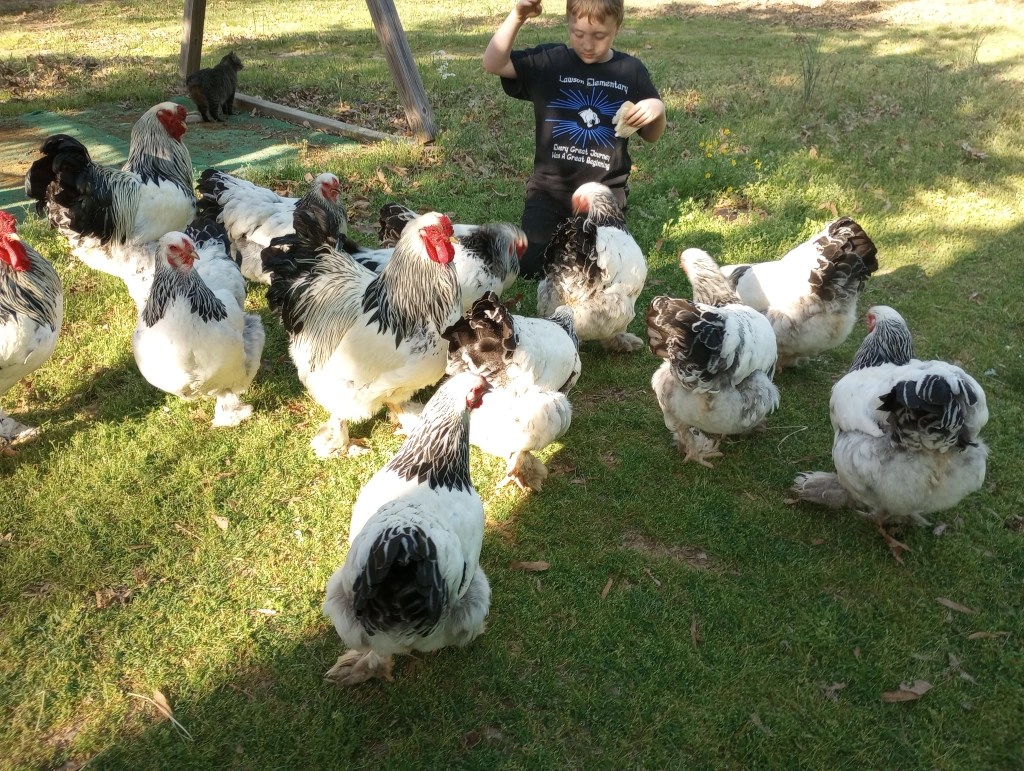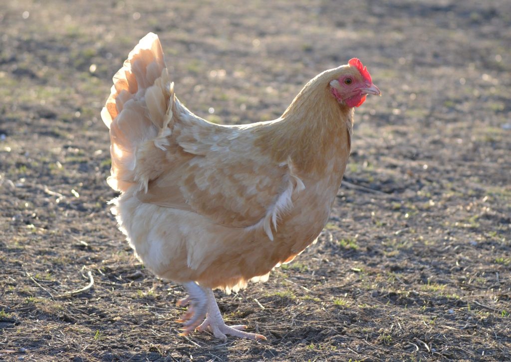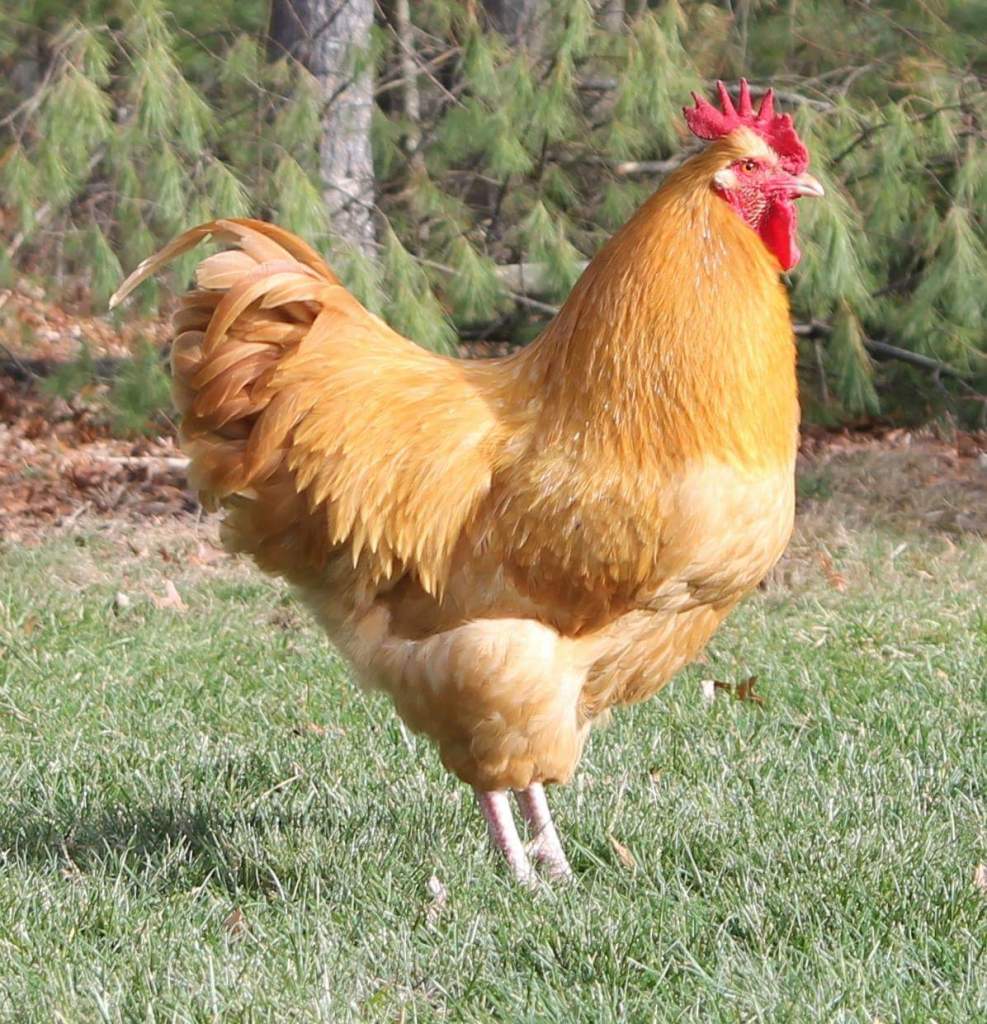 Buff Orpingtons are a “buff” or orange/golden color. They have white legs. They were produced for both meat and eggs. They are a medium layer (around 200+) of brown eggs. They go broody and are excellent mothers. Despite what any other website states, they do not do well in Arkansas heat and will need lots of shade and water. Even with our best efforts this summer, we lost a few Buff Orpingtons due to the heat. Buff Orpingtons are good with children and good for first time chicken owners. They are sweet gentle birds.