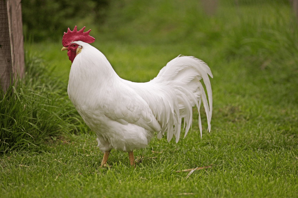 White Leghorns are a flighty bird that produces an abundance of large white eggs. When you buy eggs from Kroger, they are most likely from a White Leghorn. Our standard white leghorns originated in 2009. We did not enter any girls in the Fair but the standard (not hatchery) male White Leghorn that we entered in the 2024 County Fair won 1st place. Leghorns do not go broody. White Leghorns are a very common breed and can be found at most feed stores every Spring. They are usually already sexed and around $5-6 each.